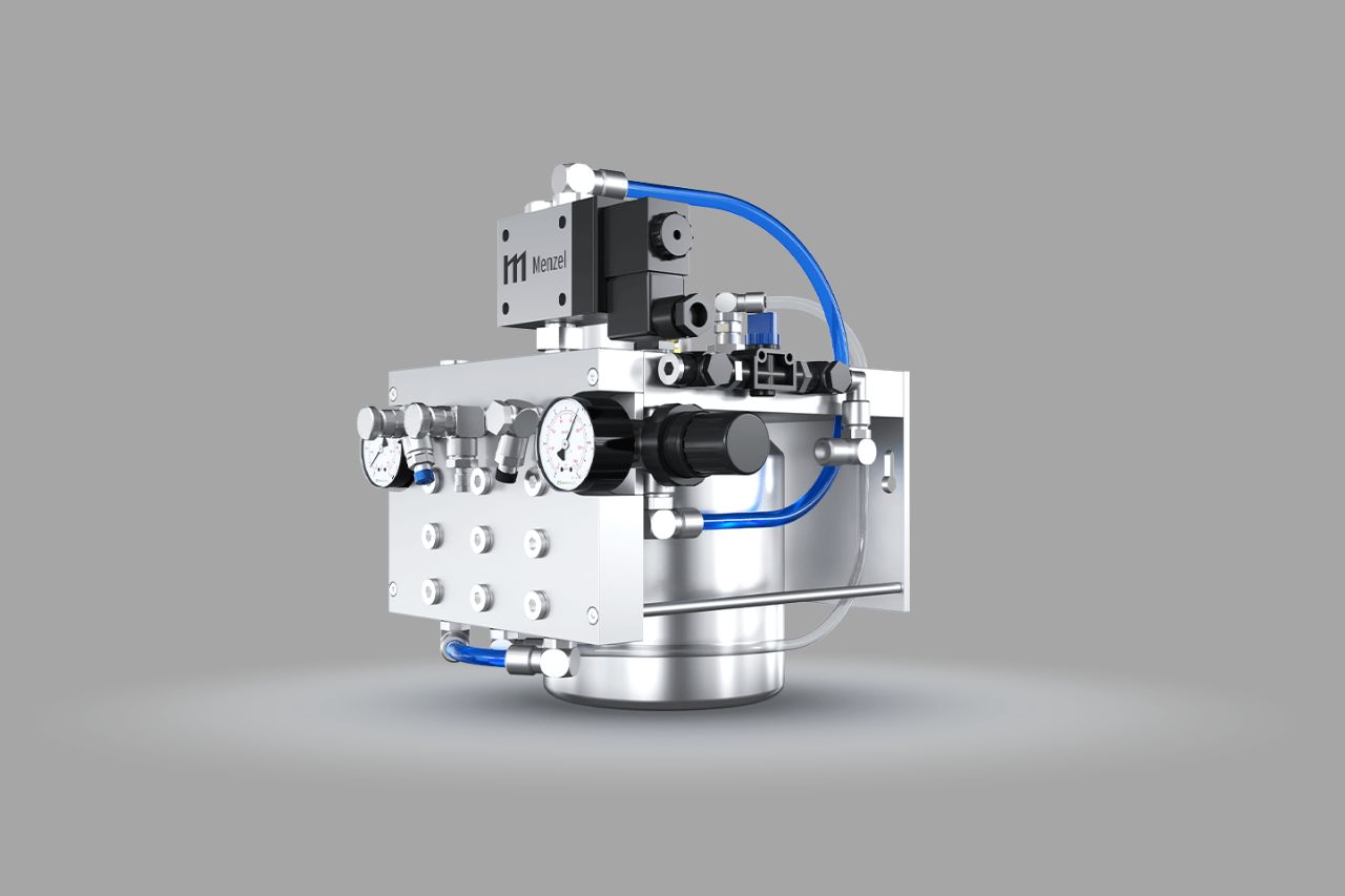 Parallel zum Steuerluft Impuls wird dem Sprühkopf über den zweiten Luftanschluss die Zerstäuberluft zugeführt. Diese zerstäubt zum einen das Medium, zum anderen wird dadurch ein zweiter Luftmantel generiert, der den Sprühstrahl ummantelt und dadurch für eine nahezu nebelfreie Sprühung sorgt. Bei Entfall der Zerstäuberluft können die Medien anstatt gesprüht auch in Tropfenform aufgetragen werden. Durch den stufenlos einstellbaren Druck können beliebige Medien vom wassergemischten Kühlschmierstoff bis zum extrem zähflüssigen Schneid- und Ziehöl versprüht werden.