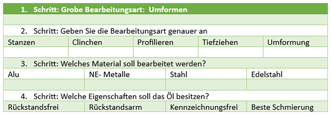 Je nachdem, wie dick das Material oder wie hoch die Materialfestigkeit bzw. der Grad der Umformung ist, desto größer sind die Umformkräfte und desto höher muss die Schmierwirkung und damit die Viskosität sein. Bei der Umformung braucht es also ein zähes Öl mit einer besseren Schmierwirkung, allerdings werden Öle bei Wärme dünnflüssiger. Wichtig ist daher die Temperaturbeständigkeit und Viskosität der Öle, im kalten Zustand zähflüssig, bei der Umformung dann dünnflüssig.